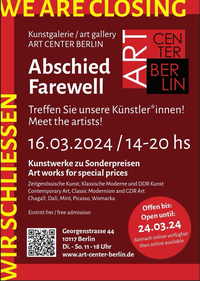 Wir möchten Ihnen mitteilen, dass wir unsere Galerieräumlichkeiten in der Georgenstraße 44 nach dem 24. März 2024 schließen werden. Derzeit ist noch offen, ob wir zukünftig in andere Räumlichkeiten umziehen werden – wir halten Sie auf dem Laufenden.